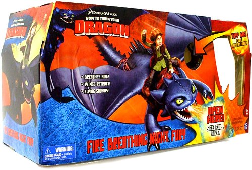 Dragons and Vikings have been at war for generations, but thats all about to change! Help Hiccup train his Night Fury, Toothless and create all-new adventures of your very own. This How to Train Your Dragon Fire Breathing Night Fury is a 2 part action figure that contains Hiccup and Toothless. Toothless has over a 2 foot wingspan and breathes fire. His wings retract for stomach dropping and dive bombing action with motion-activated screeching sound effects. Lift and lower your dragon for realistic sounds and watch his wings retract as you fly him through the air. Push the button on the on the back of Toothless and watch the blue fireball fly from his mouth for ultimate fire breathing action and cool sounds. How to Train Your Dragon Fire Breathing Night Fury is high-flying fun!