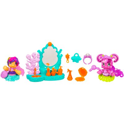 Whenever the ponies visit the sea, they magically become beautiful mermaids! They love to explore the ocean for surprises and hidden treasure. Join the MERMAID PONIES as they have waves of fun discovering this new world!Sisters CHEERILEE and SCOOTALOO love to get pretty together! They try on each others jewelry and take turns looking in the mirror.These two under the sea cuties always love to look pretty, but they need your help to find just the right look! Try different accessories and pretty pony skirts on your CHEERILEE and SCOOTALOO pony figures and let them see how they look with their vanity accessory. Then, give them a spritz of perfume or a dash of lotion to for a little extra flair. Your fashionable MERMAID PONIES figures are sure to make waves with their styles!CHEERILEE and SCOOTALOO pony figures come with a vanity set and accessories. Set includes an undersea charm.