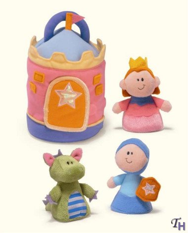 - The little princess will really enjoy playing with this activity set. The castle is approximately 6" wide and 8" high. The castle opens up for her highness to show her two removable soft regal friends and the plush pet dragon. All the characters have a rattle or squeaker in them and feature different textures and materials to stimulate little ones.