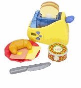 - Includes toaster, two pieces of play toast, a plastic knife, a plate, a play croissant with slices of meat and cheese, and a tub of play margarine