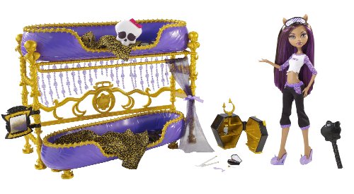 Clawdeen Wolf is the daughter of the infamous Werewolf. After a long week at school, Clawdeen Wolf is dead tired and in need of a little rest and relaxation. She is one of the trendiest ghouls at Monster High in her stylish sleepover fashion. They get together for a sleepover and some scary fun ghoul time. The Dead Tired Clawdeen Wolf Doll and Bed Playset includes a doll with eye mask, Dead Tired outfit and sleepover accessories and her very own bed. The doll is fully articulated so it can be posed in many different ways. Also, check out the rest of the Monster High Dead Tired Doll Collection, which is sold separately.