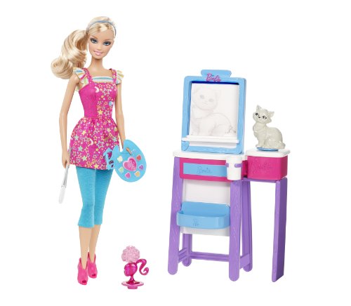 Girls can play out the role of art teacher plus have access to additional online content that allows girls to further try on the role. A code inside each package unlocks career-themed content online. The Barbie doll really paints when you press the lever in the back. A real painting appears when Barbie paints a flower vase or her cat Blissa via a cold-water color change and girls can use the girl-size brush to paint free-form on Barbie's easel, which has cold-water color change, too. The playset includes a doll, easel with cold-water color change panels, Blissa, flower vase and a paint brush both Barbie and girls can use.